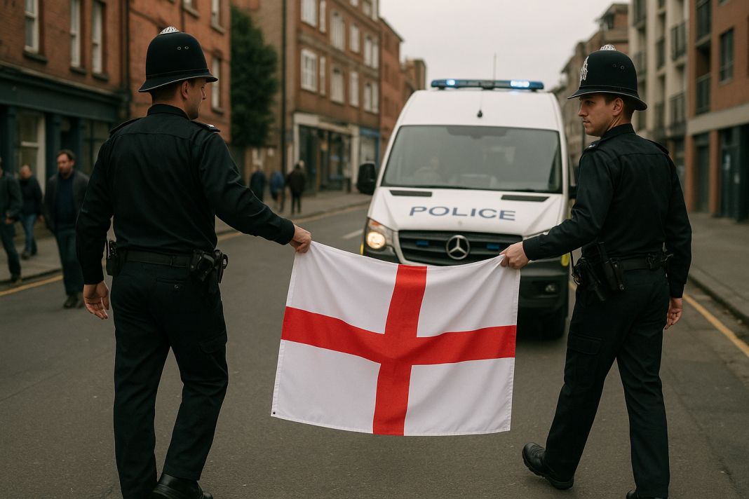 In a shocking escalation of Britain’s drive toward an ever-more inclusive public space, two officers from the Metropolitan Police took a St George’s Cross flag into custody this morning for the alleged offence of Causing Harassment, Alarm and Distress (CHAD).